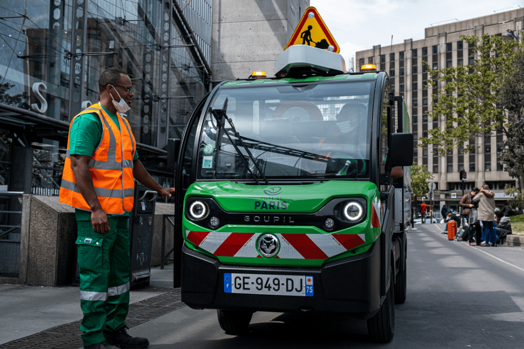 « C’est nous le ‘Goupil’, note Sylvie. Il s’agit du petit véhicule de la Mairie de Paris qui s’occupe du service « Urgence Propreté » [via l’application ‘Dans ma rue’]. On a un gilet orange et un véhicule spécial qui est différent des autres. » Lancé rue de la Convention, l’engin file vers Montparnasse. L’objectif : vider les poubelles Big Belly [Poubelles intelligentes auto-compactantes] disposées près de l’entrée principale de la gare, sur l’esplanade. Le véhicule léger se fraye un chemin entre les voyageurs et leurs valises pour accéder aux poubelles.