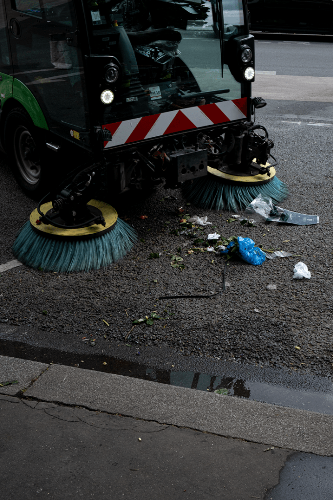 Il supervise le travail des éboueurs répartis le long du large trottoir. Tel un ballet de rue, la caravane des véhicules se met en branle selon une procédure bien établie. Le premier groupe de balayeurs réunit les déchets et regroupe les tas déjà constitués, bientôt chargés à bord des camions-poubelles déployés pour l’intervention. Une machine équipée de brosses se charge d’aspirer les résidus et d’asperger d’eau le trottoir. Un lancier ferme la marche pour rendre l’espace public aux habitants. Le nettoyage aura duré moins d’une heure.