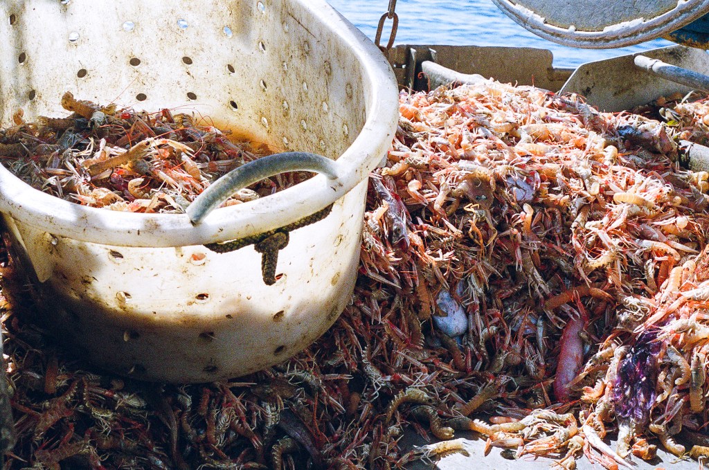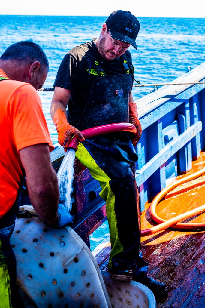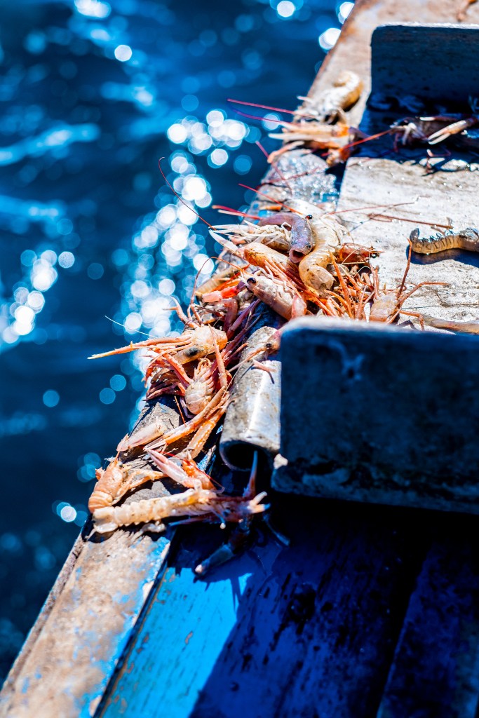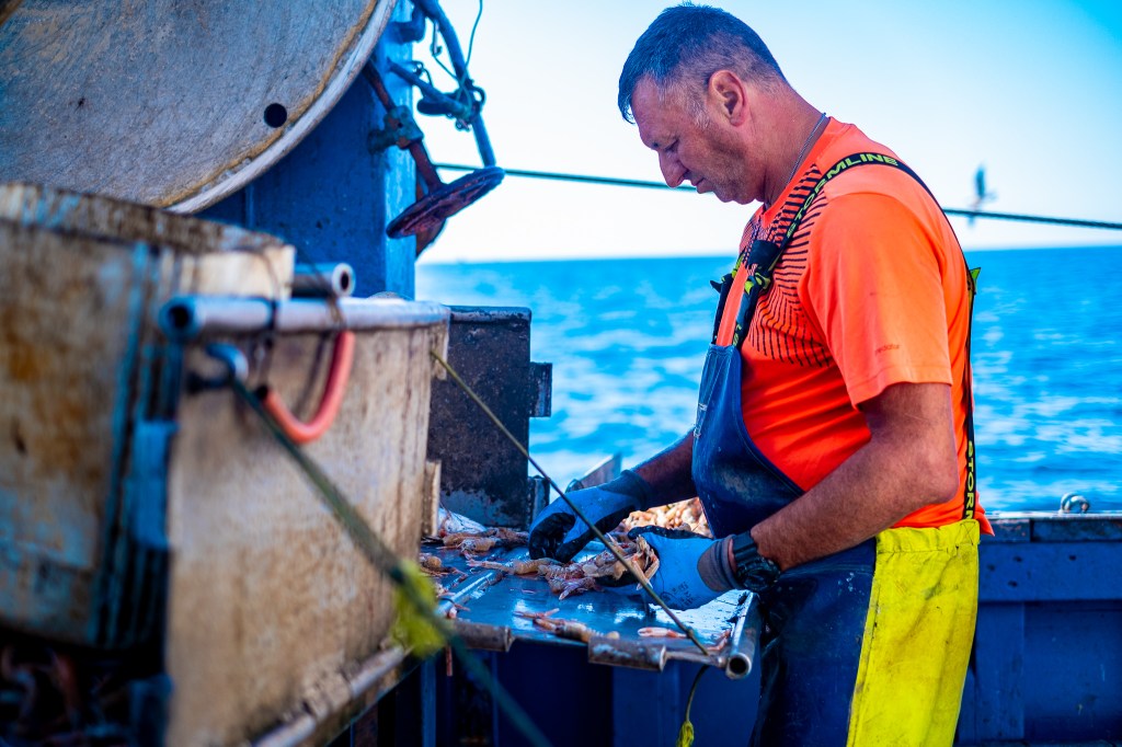 Il est 10h30 quand les chaluts commencent à sortir de la mer. Les grincements du métal rouillé par l’eau salée accompagnent l’émersion des bouées puis des filets qui s’enroulent autour de leur axe. Pacou et Kevin agrippent chacun une des extrémités afin de faciliter son ouverture au-dessus des bacs métalliques positionnés à l’arrière du bateau. Une avalanche de langoustines se répand dans une pluie d’eau salé sur les plateaux des deux bacs. Les deux hommes ont le sourire : la pêche du matin est bonne. Le temps est désormais compté. Ils ont deux heures pour trier les crustacés avant la deuxième pêche du jour car les deux chaluts, à peine remontés, sont aussitôt redescendus à cent mètres de profondeur.