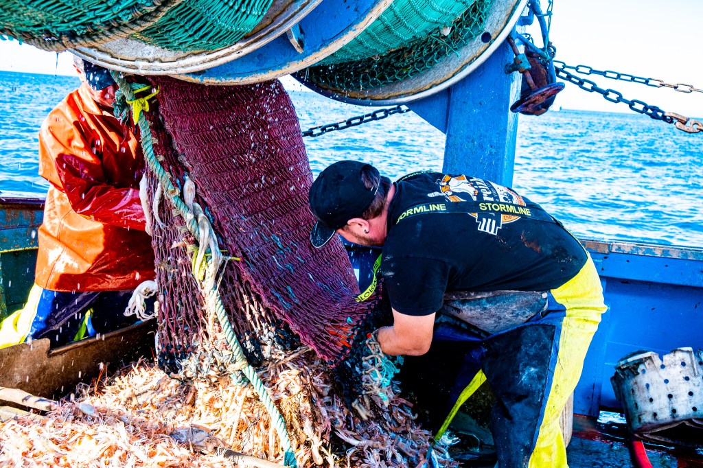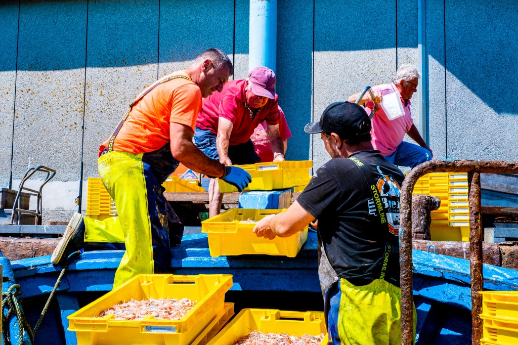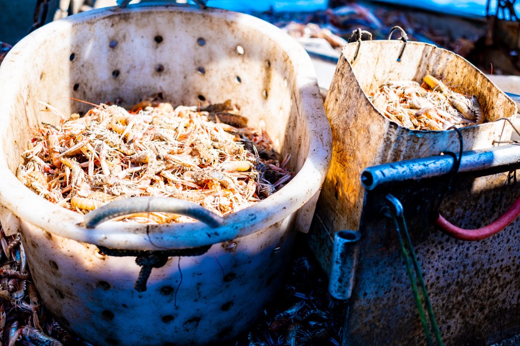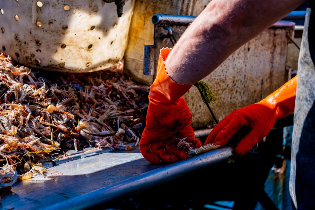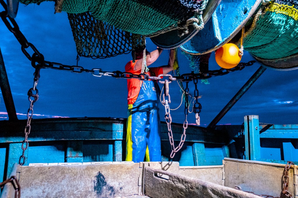 Il est 10h30 quand les chaluts commencent à sortir de la mer. Les grincements du métal rouillé par l’eau salée accompagnent l’émersion des bouées puis des filets qui s’enroulent autour de leur axe. Pacou et Kevin agrippent chacun une des extrémités afin de faciliter son ouverture au-dessus des bacs métalliques positionnés à l’arrière du bateau. Une avalanche de langoustines se répand dans une pluie d’eau salé sur les plateaux des deux bacs. Les deux hommes ont le sourire : la pêche du matin est bonne. Le temps est désormais compté. Ils ont deux heures pour trier les crustacés avant la deuxième pêche du jour car les deux chaluts, à peine remontés, sont aussitôt redescendus à cent mètres de profondeur.