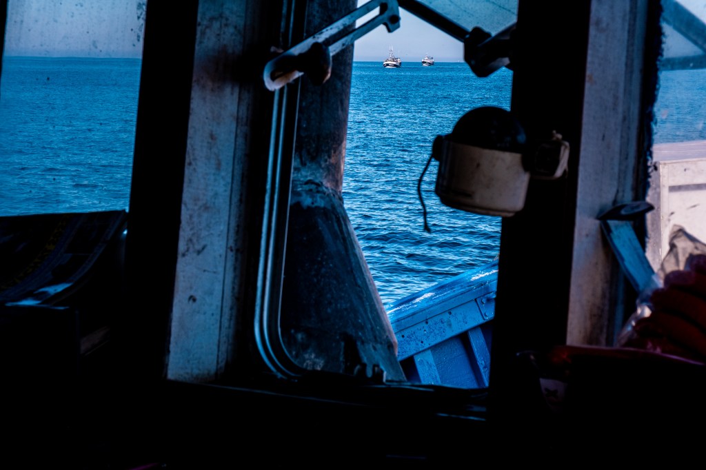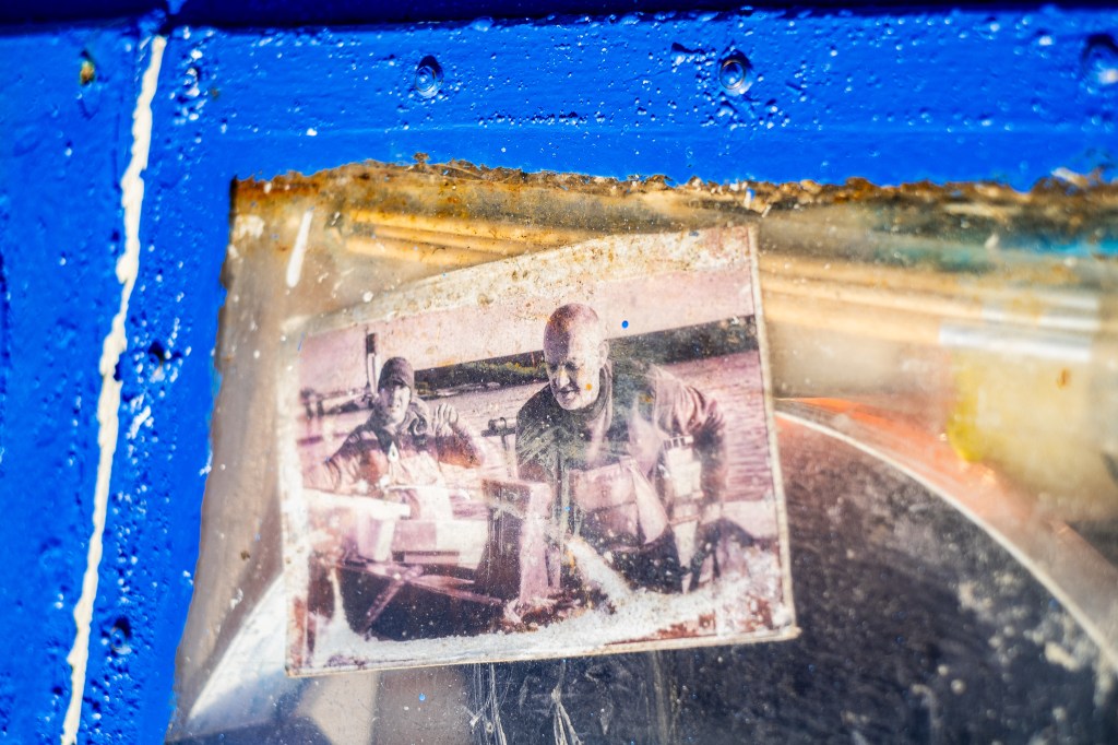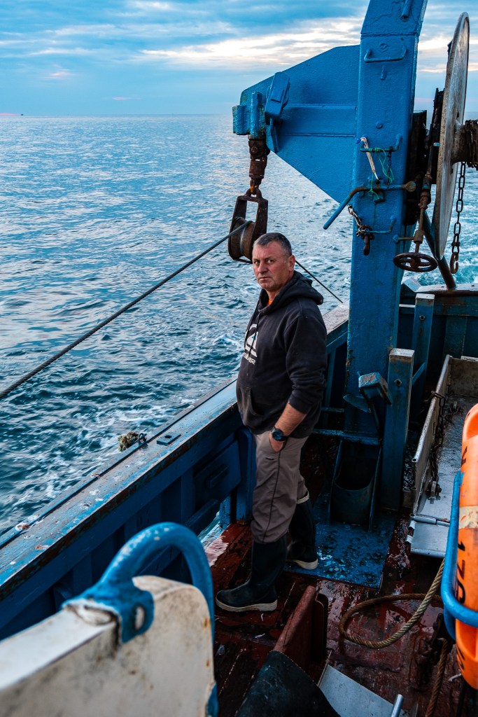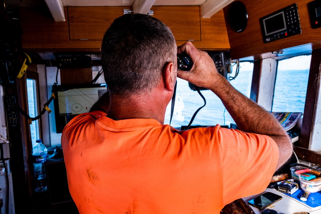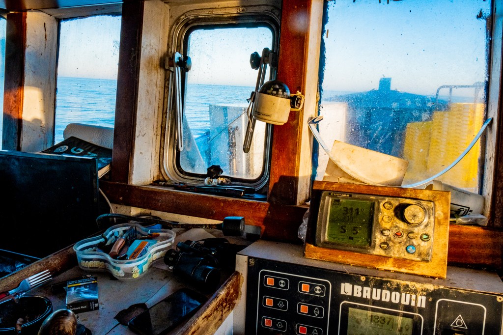 La radio de bord grésille. Kevin est interrompu par les voix lointaines de marins sur le canal 16. Le bateau se trouve désormais à 22 kilomètres des côtes invisibles. Tout autour, l’océan à perte de vue. La continuité de la ligne d’horizon est seulement coupée par endroits par la présence des autres navires de pêche. « En ce moment, nous sommes une trentaine au départ du Guilvinec à pêcher la langoustine. Il y a une dizaine de bateaux à Saint-Guénolé et environ 15 à Loctudy » compte Kevin. Le patron-pêcheur partait, avant la fermeture de la criée en 2008, du port de Lesconil. Dans la famille de Kevin, la pêche se transmet de père en fils. « J’ai commencé en 1999, à 15 ans avec mon père, sur le bateau de mon grand-père. J’ai pris les commandes en 2008, au départ à la retraite de mon père [la retraite est possible à partir de 37 ans et demi d’activité], puis je l’ai racheté en 2016. Le bateau a 50 ans ! »