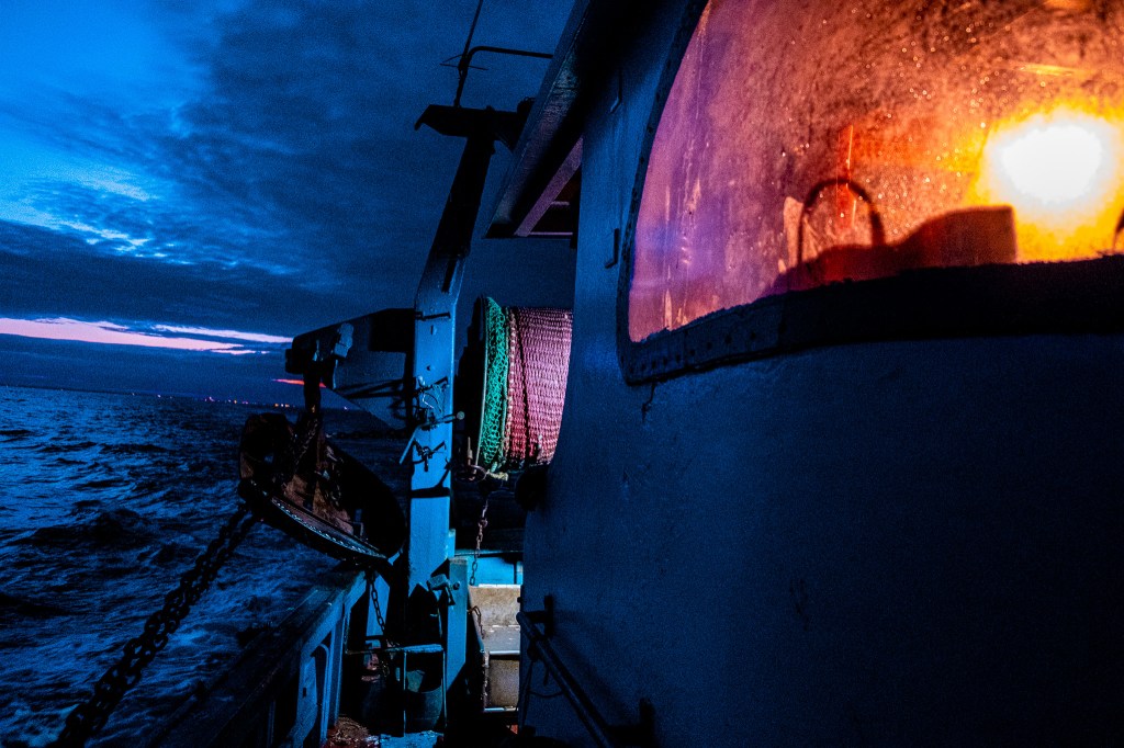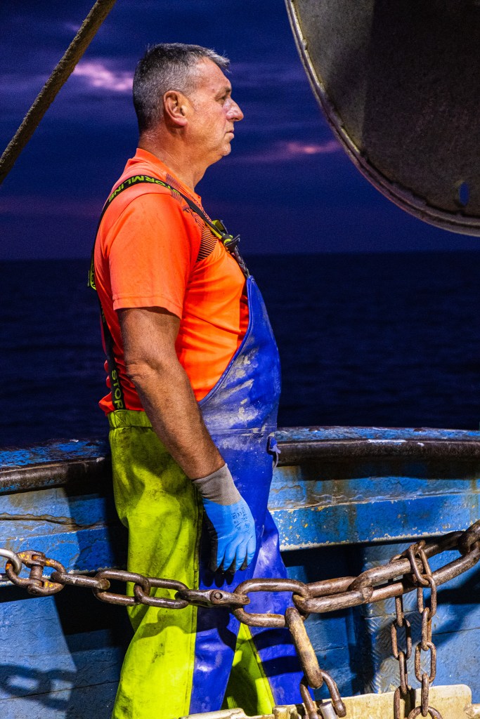 Dans l’obscurité du jour naissant, un bateau solitaire avance sur la mer. Seuls les points scintillants de la côte et les fines bandes de lumière entre deux nuages permettent de distinguer le ciel de la terre au large de Penmarc’h (Finistère sud). Bercé par le mouvement des vagues et le bruit assourdissant du moteur, l’équipage s’enfonce vers l’horizon de la pêche dans la somnolence des dernières heures de la nuit.