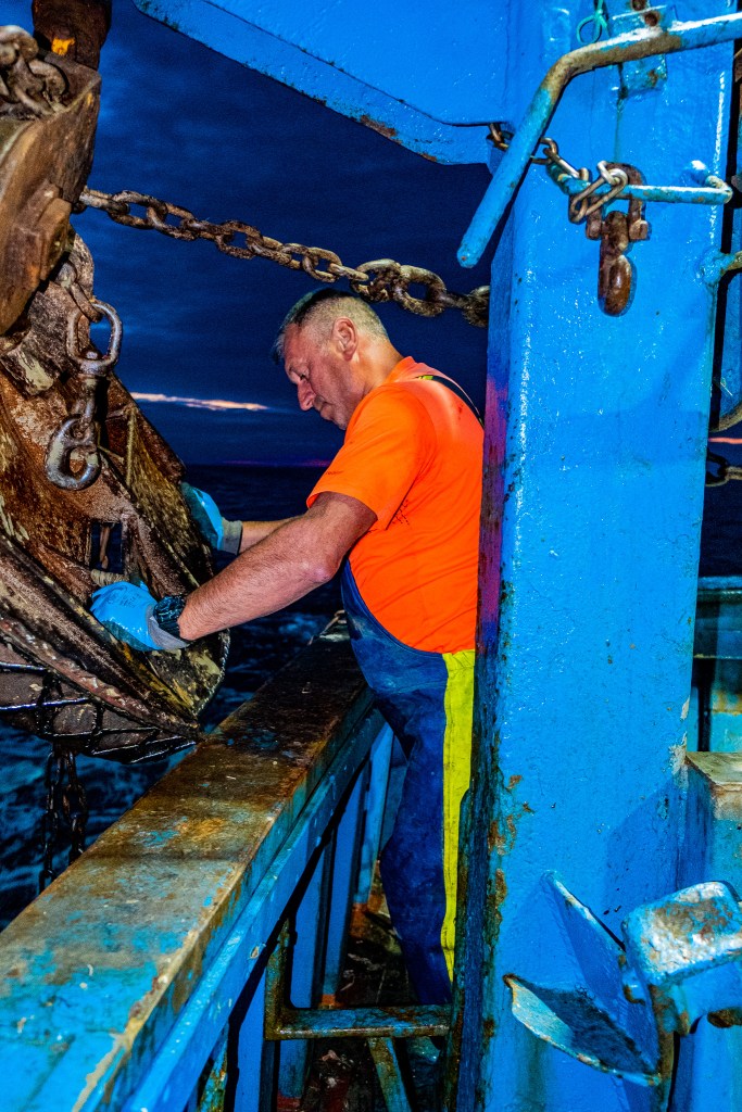 « Il faut arriver avant le lever du jour mais là où l’on va, il vaut mieux que le jour soit levé. Si tu mets le chalut la nuit en place, tu vas pêcher plein de merlans » explique Pacou, patron-pêcheur à la retraite qui remplace le marin de Kevin pendant ses vacances. Les deux hommes ne chassent pas le poisson mais la langoustine. Ce crustacé d’environ 13 centimètres vit dans un terrier creusé dans la vase du plateau continental dont il ne sort qu’à l’aube et au crépuscule pour se nourrir. Le regard fixé sur le sondeur, Pacou vient rompre le bruit monotone des machines. « Ça creuse. » L’écran indique 92 mètres. « La profondeur pour pêcher la langoustine ? Ça dépend. Elle peut être à 80 ou bien à 100 mètres. Plus tu descends, plus ça creuse. »