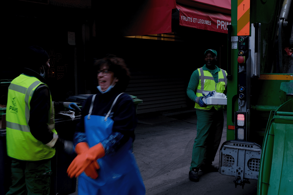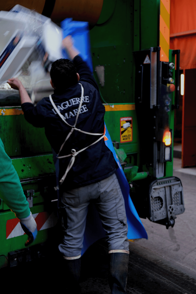 Le temps est compté pour la petite équipe qui progresse rapidement. Il faut nourrir la benne grande ouverte, toujours insatiable, qui se remplit à vue d’œil. Le camion quitte l’avenue, prend une voie perpendiculaire et s’engage dans la rue Daguerre. Les commerces fermés voient passer les employés de la poissonnerie ou de la boucherie. Quelques mots complices sont échangés. « Dans certaines rues, il ne faut pas passer avant 7 heures pour ne pas déranger les gens » glisse Mebrouk, un carton dans les bras.
