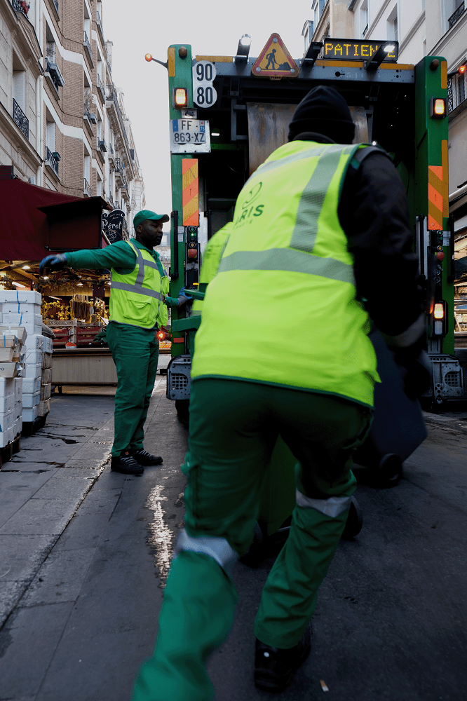 Derrière nous, Mebrouk et Jimmy attendent à l’arrière d’un des camions. Les deux éboueurs et leur chauffeur sont prêts à partir. Le responsable nous quitte sur un dernier mot : « C’est physique. Les bacs ne sont pas faciles à porter même si c’est mécanisé. Ils ont de la charge. Ils marchent beaucoup. À la longue, ça use ! »