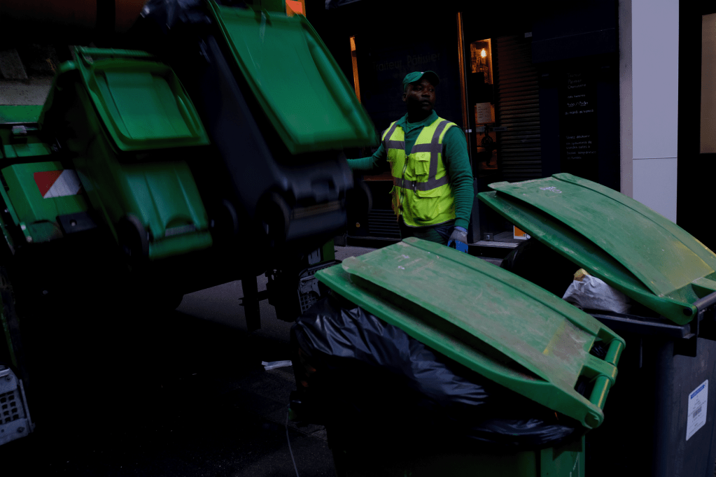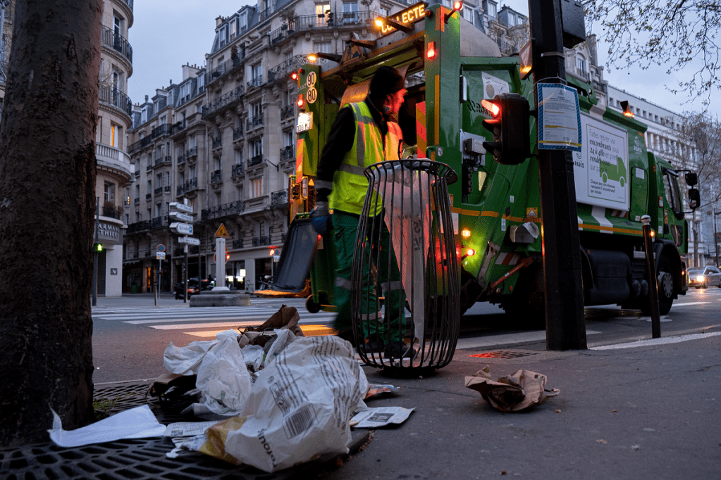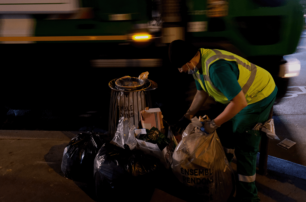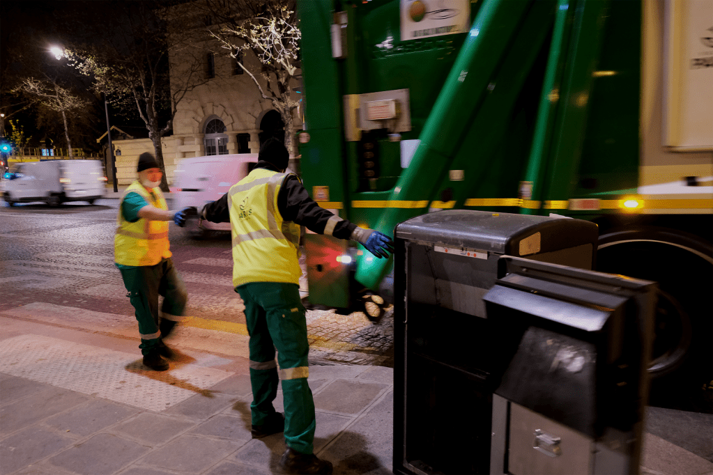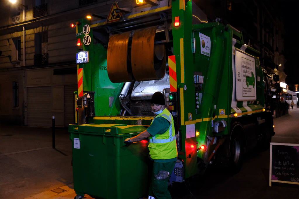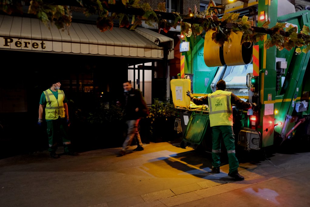 Debout sur le marchepied, le ballet nocturne se poursuit. Ils montent, descendent, parfois progressent à pied jusqu’à la poubelle suivante entre les premiers vélos, les voitures et les bus qui passent tout près. La vigilance s’impose pour ne pas risquer un accident. Parfois, un conteneur trop chargé ou mal fixé se renverse dans un bruit sourd.